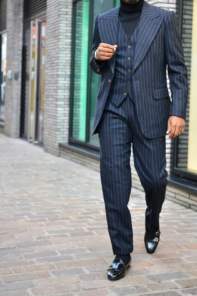 The Enzo three piece suit is handmade using a fabulous navy chalk stripe flannel wool and cashmere blend cloth that will ensure you stand out from the crowd. This suit is made in a winter weight flannel suitable for cooler temperatures. The single breasted jacket is paired with a 5 button waistcoat and well tapered pleated Ghurka style trousers to give a very modern twist to a very classic style.