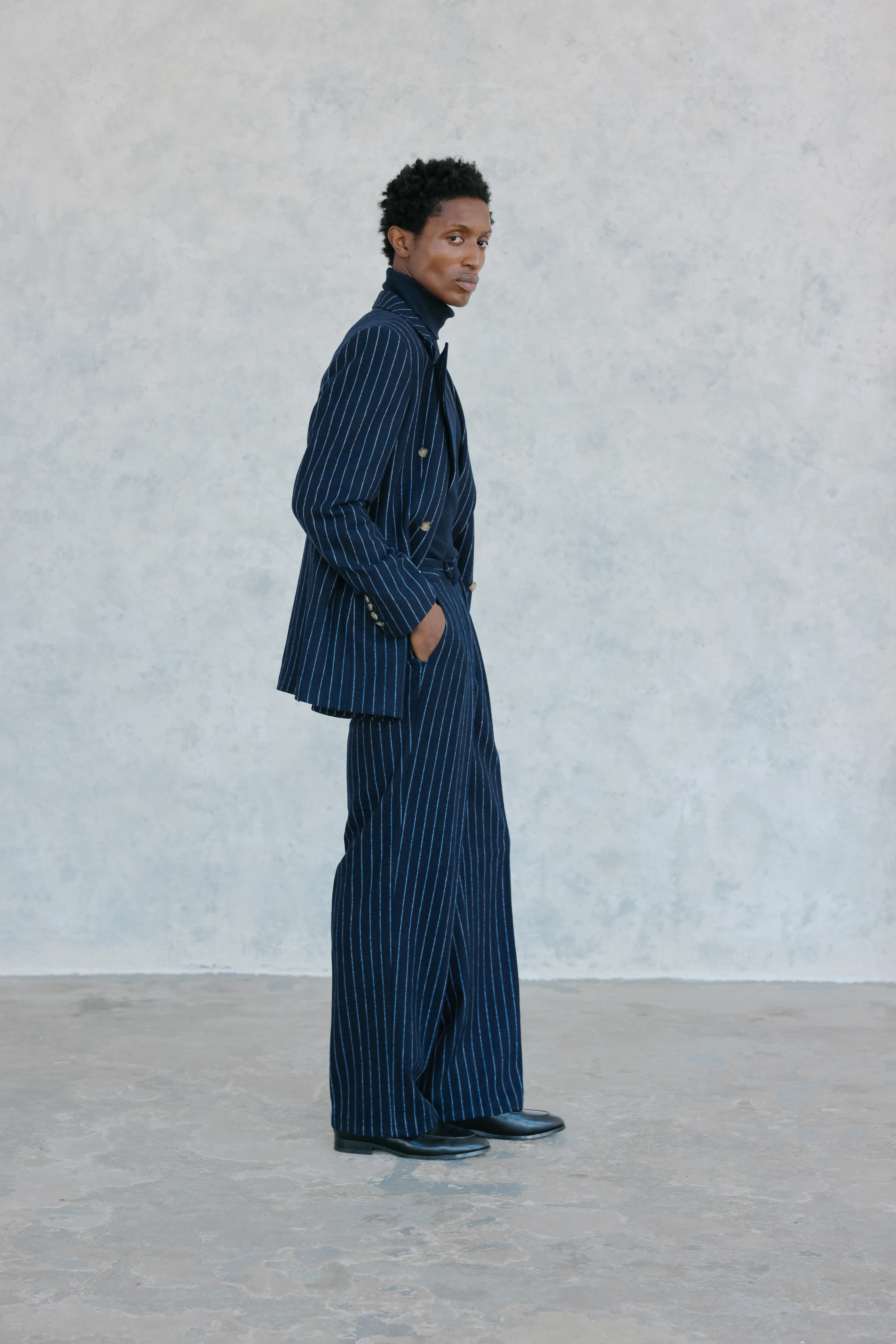 The Manhattan DB Blazer captures the timeless elegance of British tailoring, reimagined for the modern wardrobe. Crafted from a 450g blue flannel chalk stripe cloth, this 6 on 1 double breasted blazer embodies both strength and subtlety, a perfect balance of structure and ease. The heavier flannel lends itself beautifully to cooler temperatures, offering warmth and presence without sacrificing fluidity.