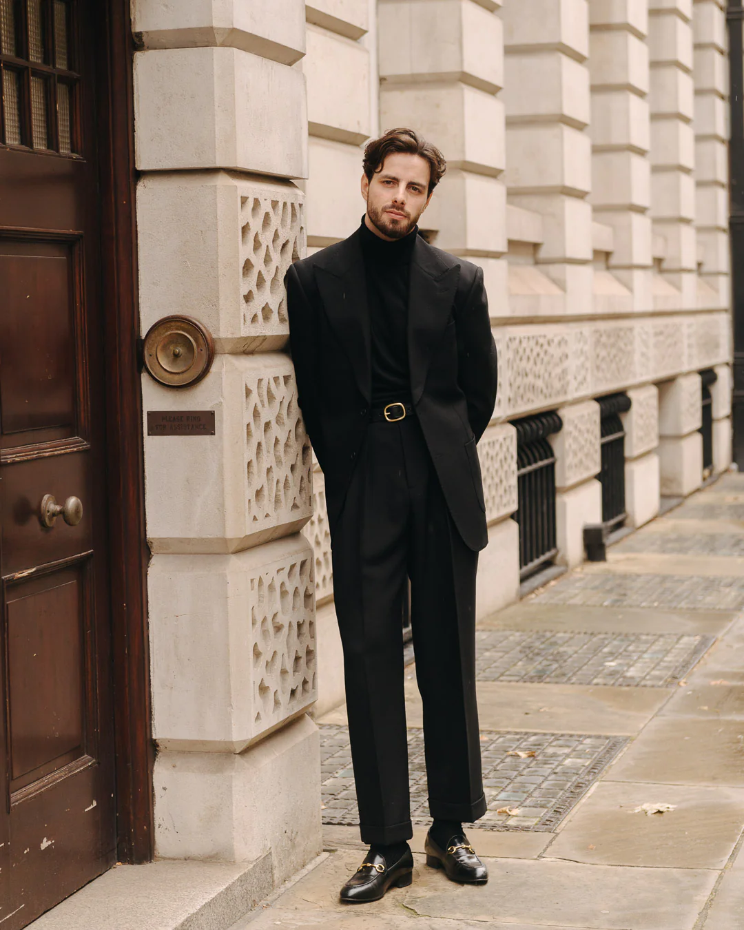 The Portobello Blazer is a standout item made for the fashion forward man. This tailored blazer is highly inspired by 1970's tailoring with its wide lapels and structured silhouette. The Portobello Blazer is made from a splendid black wool cloth to execute a chic winter attire. Whether this blazer is worn for a formal or casual occasion it will certainly turn heads.